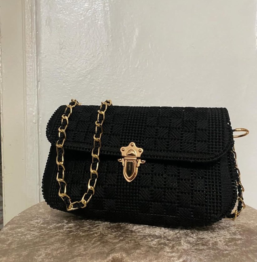 El emeği çanta Siyah örgü kumaş ve nakış detaylı, altın zincirli kadın çantası. Klasik ve modern tarzı birleştirir, günlük kullanıma uygundur.