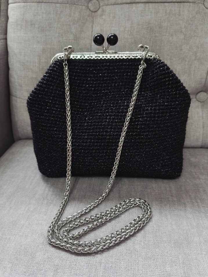 Günlük kullanım için uygun, zincir detaylı siyah örgü kadın çantası. Vintage gotik tarzda, siyah boncuklu kapama detayına sahiptir.