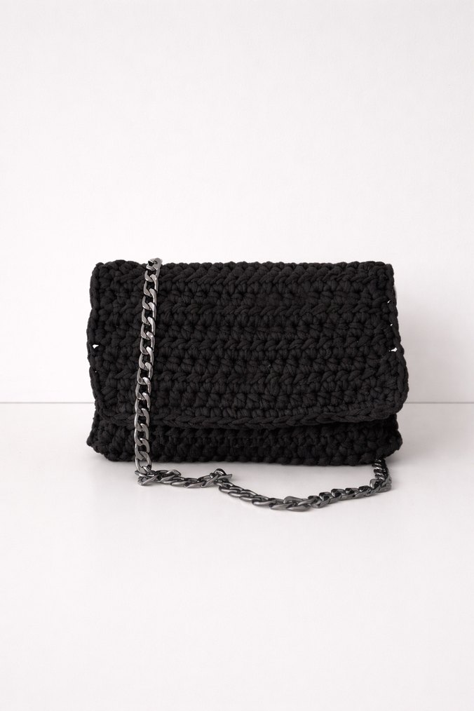 Zincir detaylı, siyah örgü kadın çanta, çıtçıtlı ve desensiz tasarımıyla günlük kullanıma uygundur.