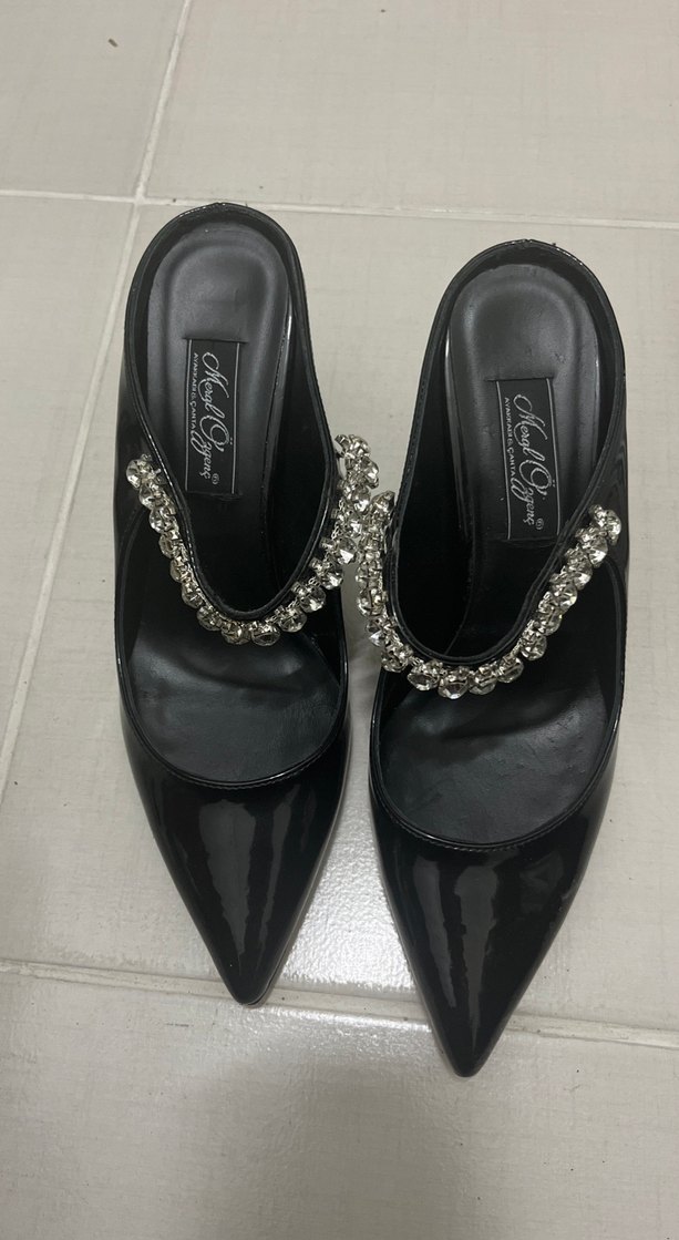 Siyah parlak yılan desenli, zincir detaylı, kauçuk malzemeden stiletto topuklu ayakkabı. Klasik şıklık ve düğünler için uygundur.