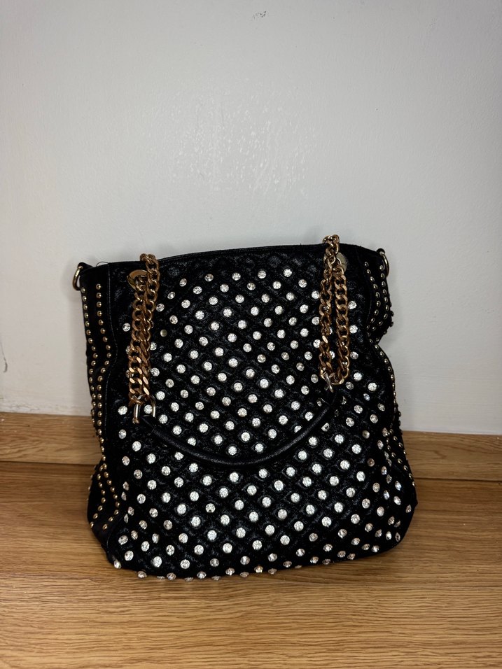 Zincir detaylı siyah deri çanta, taşlı deseni ve çağdaş bohem tarzı ile günlük kullanıma uygundur.