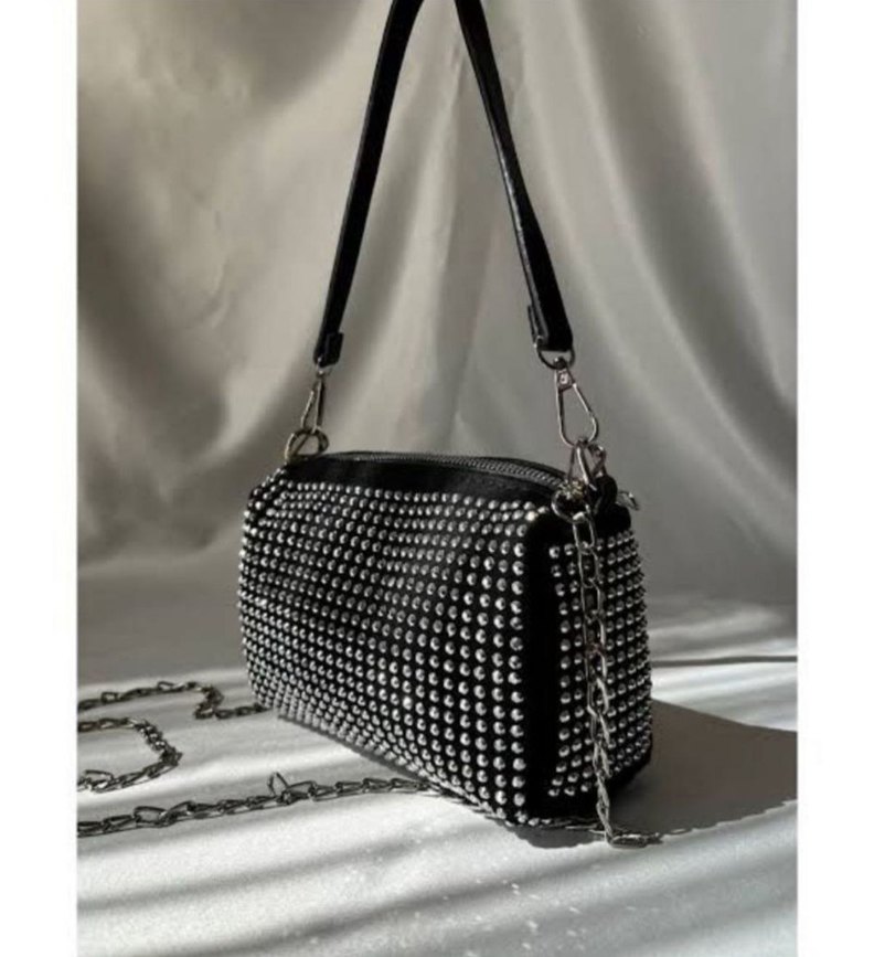 Zincir detaylı siyah deri çanta, rock punk tarzı ve ışıltılı görünüme sahip. Günlük kullanım için uygundur, desensiz tasarımıyla öne çıkar.