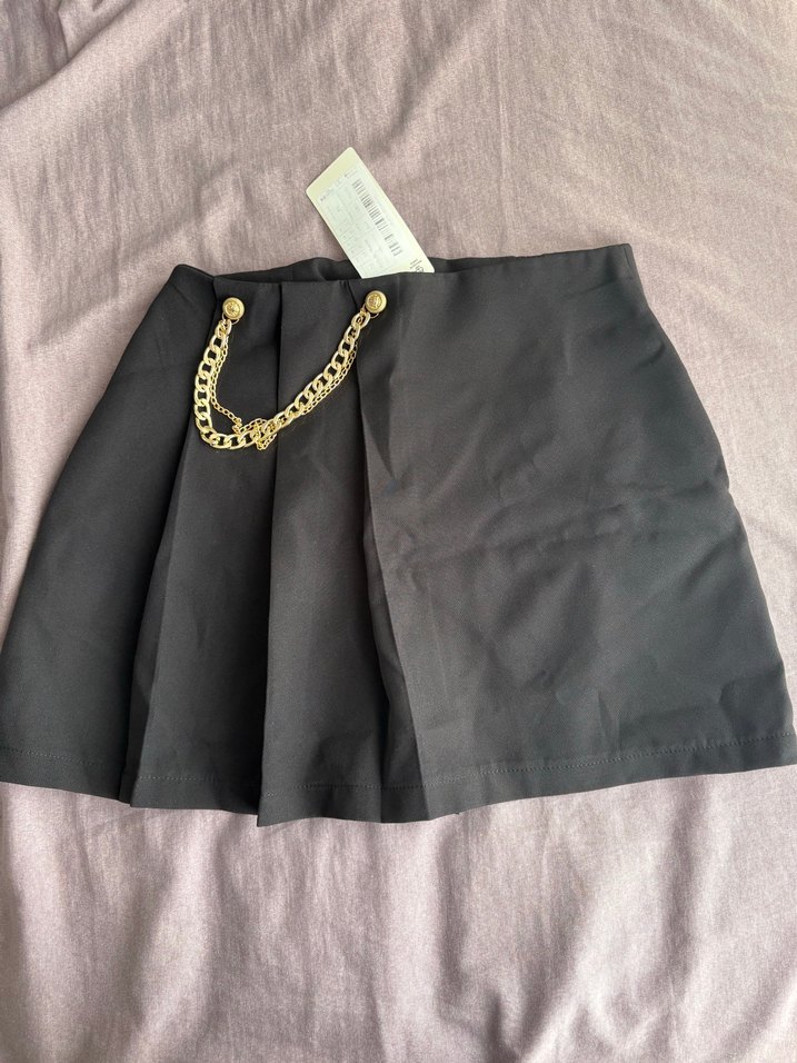 Zincir detaylı, bol kesim siyah şort etek. Sentetik kumaştan üretilmiş, günlük rahat kullanıma uygun etiketli