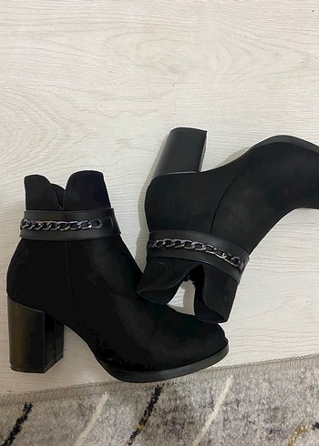 Zincir Detaylı Siyah Süet Blok Topuk Bot
