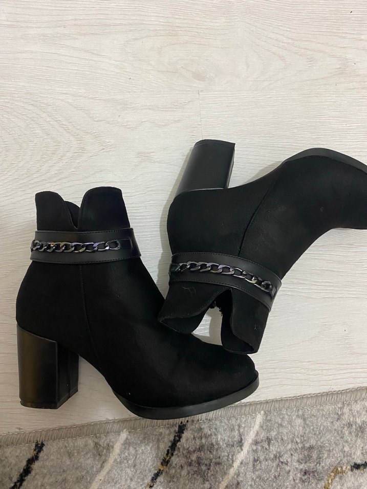 Siyah süet blok topuklu botlar, zincir detayları ve hafif yılan desenli dokusuyla günlük kullanıma uygun gotik tarzda. 1 kere giyildi
