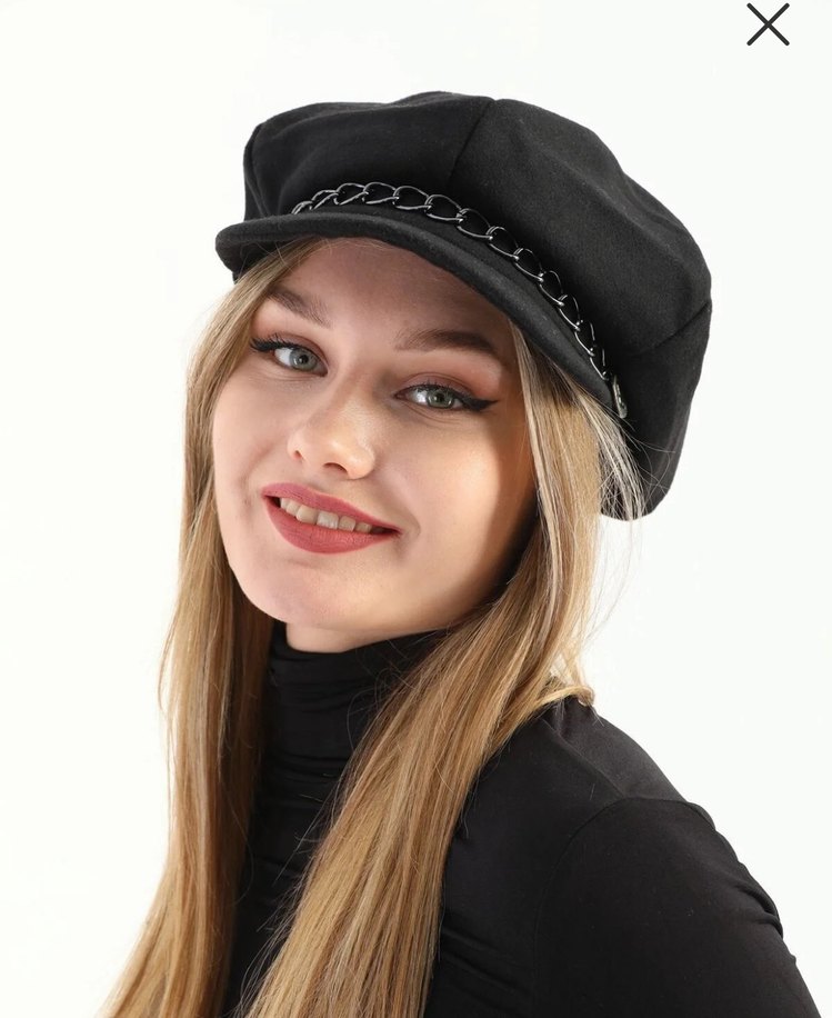 Parlak siyah süet kumaştan, zincir detaylı kadın şapkası. Trendy gotik ve Paris tarzına uygun şık aksesuar.