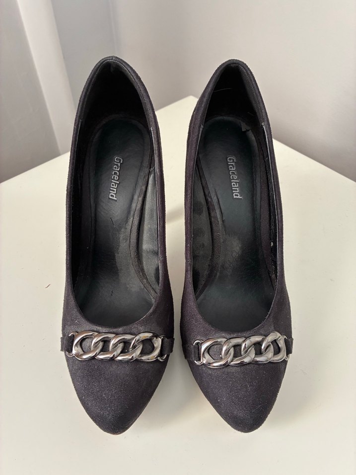 Ofis için uygun, zincir detaylı siyah süet stiletto, kalın topuklu ve gotik tarzda tasarlanmıştır.