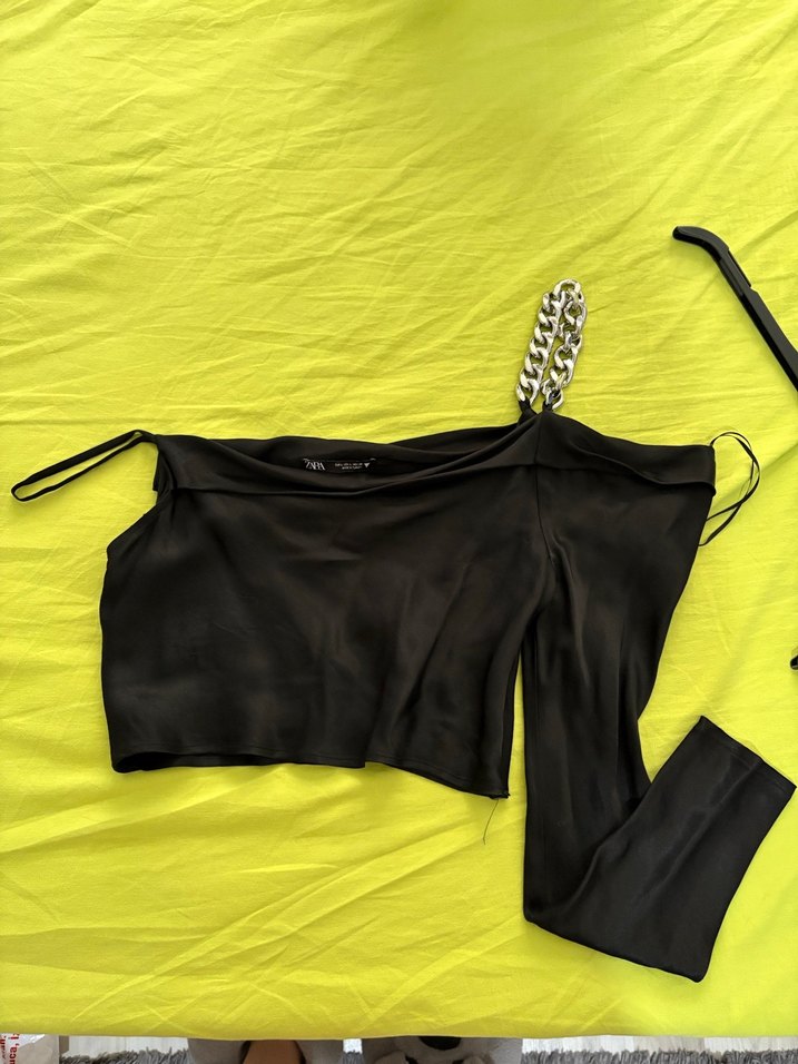 Omuzda zincir detaylı, siyah tek kollu bluz. Parti ve sokak stili için uygun.