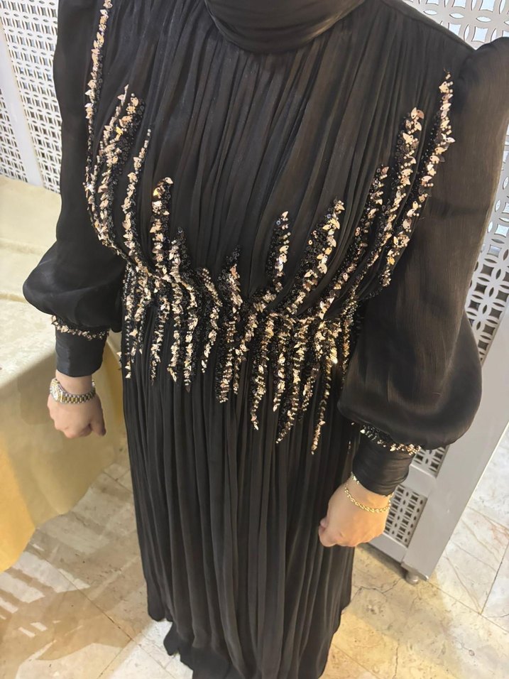 Siyah, zincir işlemeli, uzun ve bol kesim abiye elbise. V yaka ve uzun kollu, parlak kumaşlı, bohem ve göz alıcı tarzda, parti için uygun. ✨