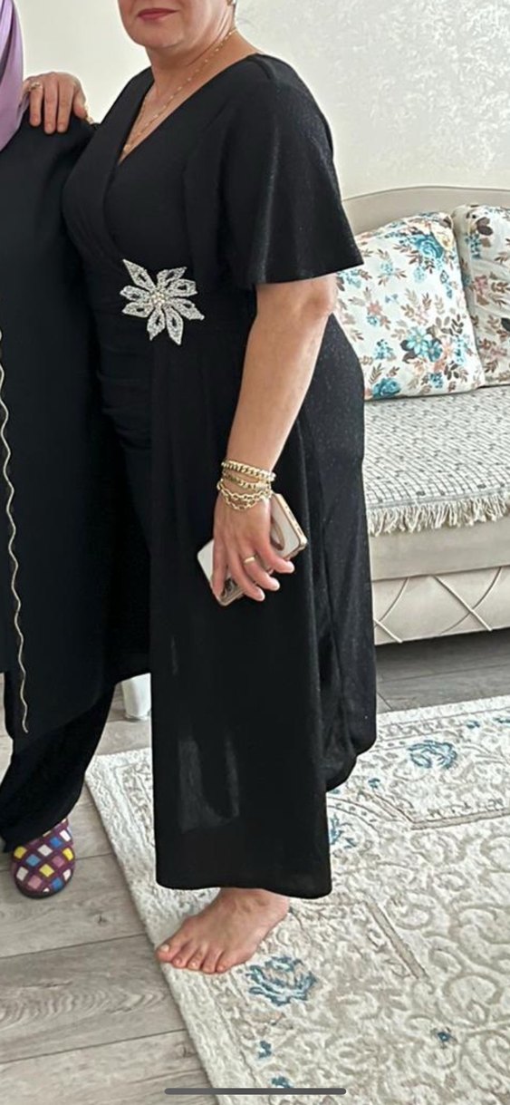 Taş detaylı detaylı v yaka ve işlemeli parlak kumaşlı siyah uzun abiye elbise. Parlak yüzeyi ve klasik kesimiyle düğünler için uygun.