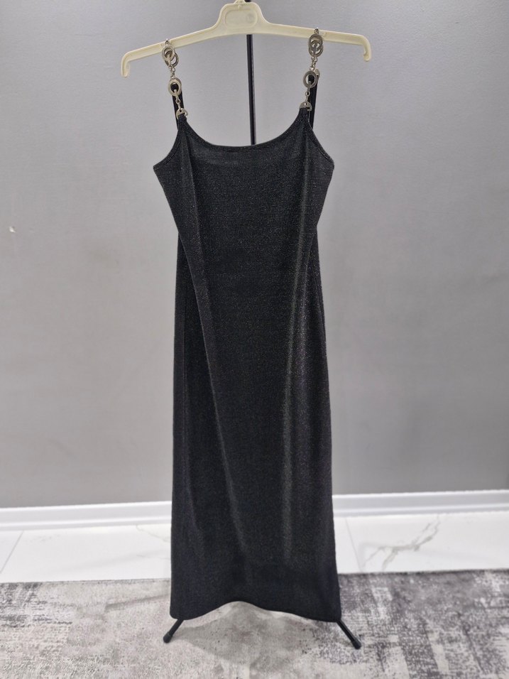 Simli Zincir detaylı askılı, straplez yaka ve ince kesimli uzun siyah abiye elbise. Minimalist ve gotik tarzda, romantik akşamlar için ideal. isterseniz uzun kollu gomlegi var kullanabilirsiniz sik aksamlat icin