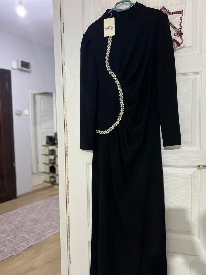 Bu siyah uzun abiye elbise, zincir detayı ve yüksek yakası ile dikkat çeker. İnce kesimi, uzun kolları ve yılan deseni ile gotik stil ve klasik şıklığı birleştirir.