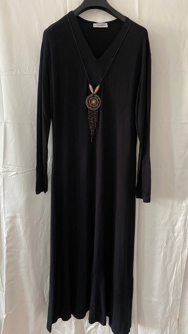 Siyah, zincir detaylı uzun elbise, ipeksi kumaş ve bol kesim ile bohem tarzı yansıtır. V yaka ve uzun kolludur, günlük kullanım için uygundur.