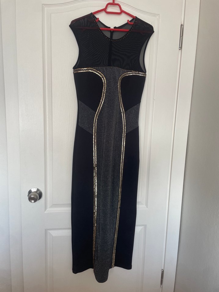 V yaka, zincir detaylı ve uzun siyah elbise, modern klasik tarzda avant-garde dokunuşlar taşır.