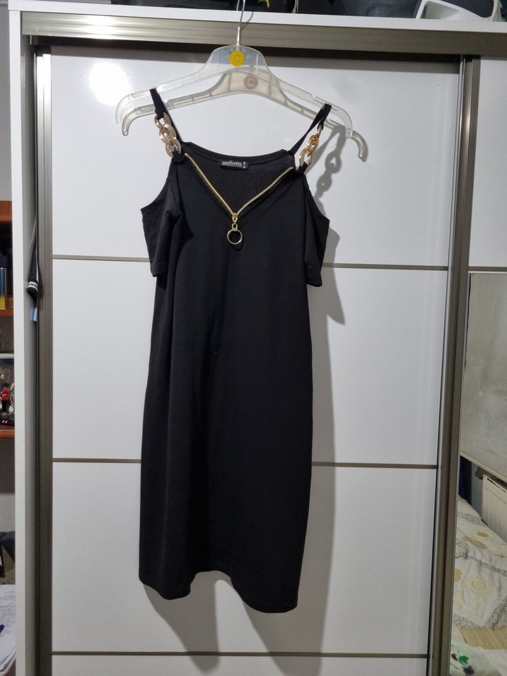 Zincir detaylı, askılı siyah uzun elbise, straplez yaka ve dar kesimiyle şık ve minimalist bir görünüm sunar.