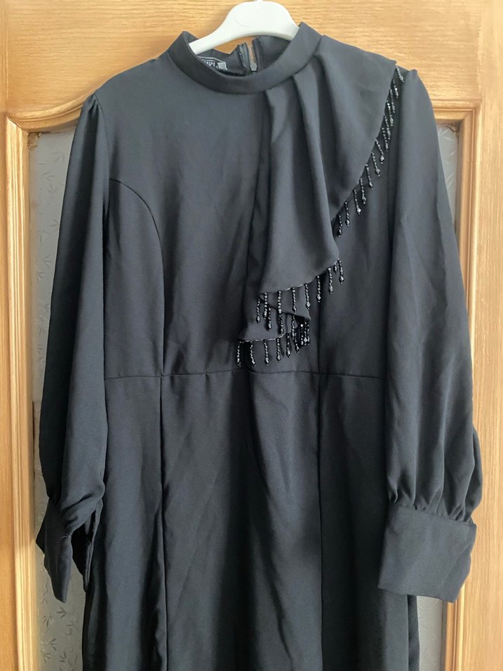 Siyah renkte, zincir işlemeli detaylara sahip, yüksek yakalı, uzun kollu ve bol kesim gotik tarzda uzun elbise.