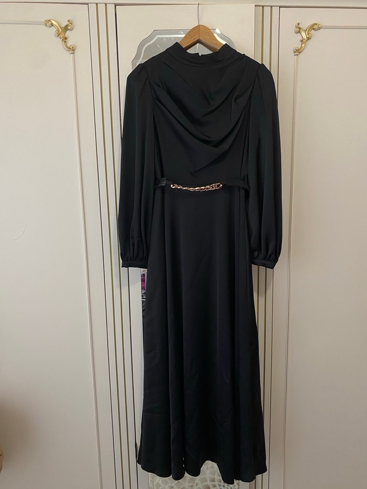 Yüksek yakalı, uzun kollu ve bol kesimli siyah uzun elbise, zincir detaylarıyla gotik tarzda tasarlanmıştır. Sentetik kumaştan üretilmiştir. 38 beden