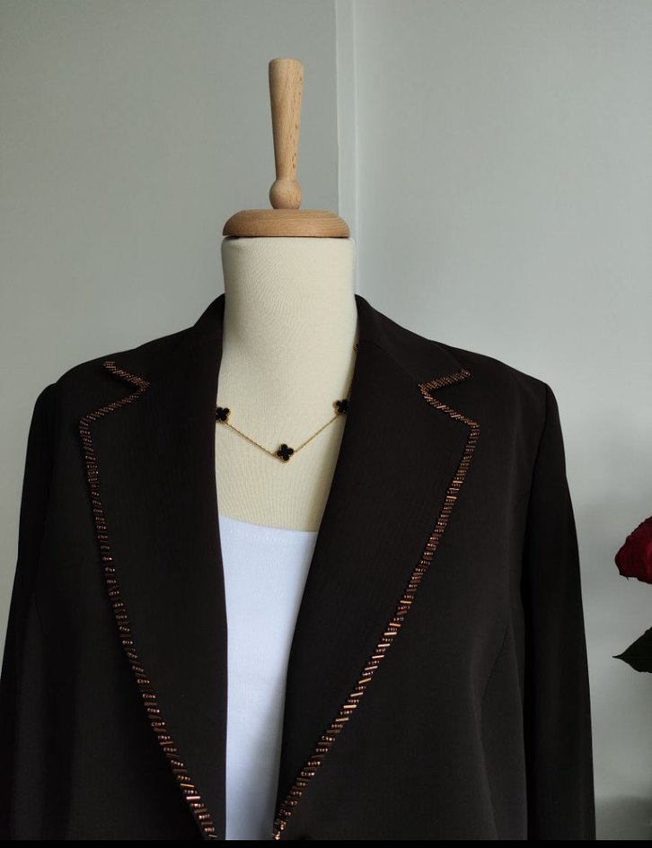 Zincir detaylı, işleme desenli siyah uzun kadın blazer. İpek gibi kumaştan, klasik şıklıkta, ofis için uygun, regular fit ve kolsuz tasarım.
