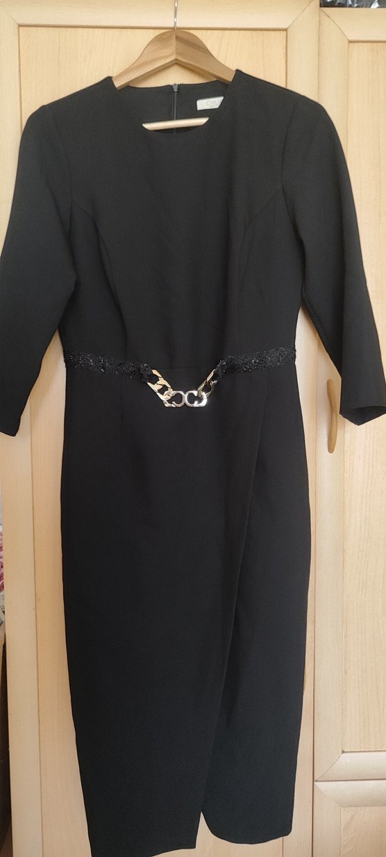 Zincir detaylı, uzun ve vücuda oturan siyah kadın elbise. Notched lapel yakalı ve yarım kollu, klasik ve gotik ofis tarzına uygun.