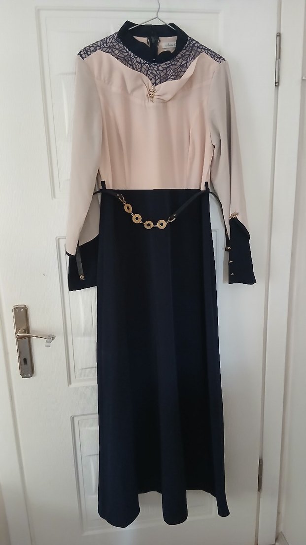 Uzun kollu, yakalı lacivert pudra uzun elbise, belinde kemer detayıyla. İpek gibi kumaştan, regular fit, hem özel hem günlük kullanım için modern klasik tarzda.