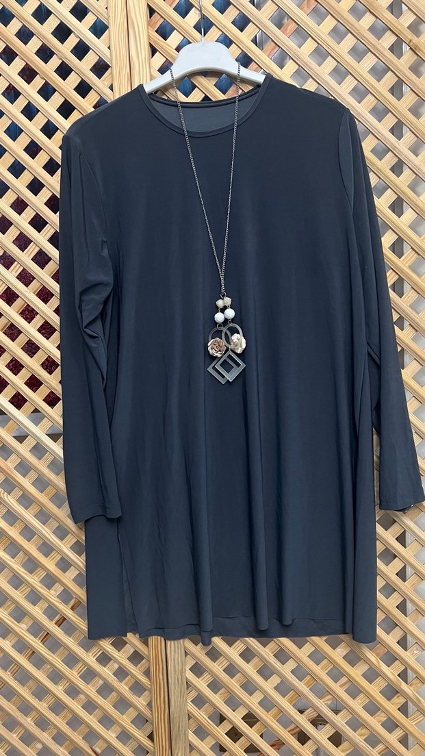 Siyah renkte, uzun kollu ve bol kesim bohem tarzı tunik. Yumuşak sentetik kumaştan, zincir detaylı kolye ile tamamlanmıştır. Bir beden 36 44 uyumludur iki beden 46 48 uyumludur