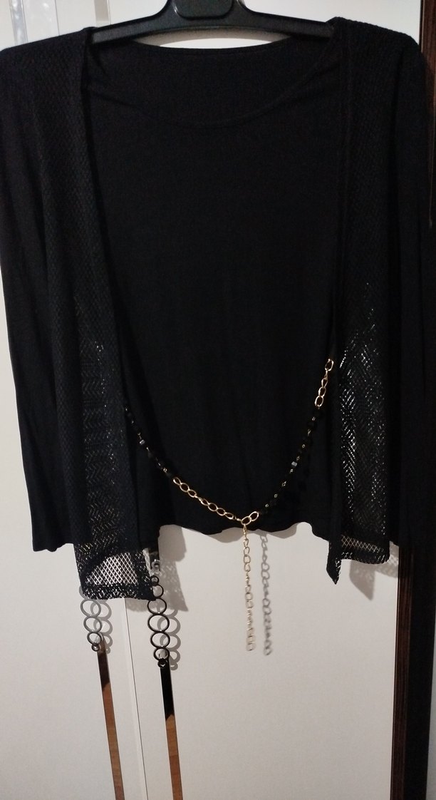 Siyah, uzun kesim, bol kesim bluz, kruvaze yaka ve askılı kollara sahiptir. İpek penye kumaştan üretilmiş olup zincir detayları barındırır.
