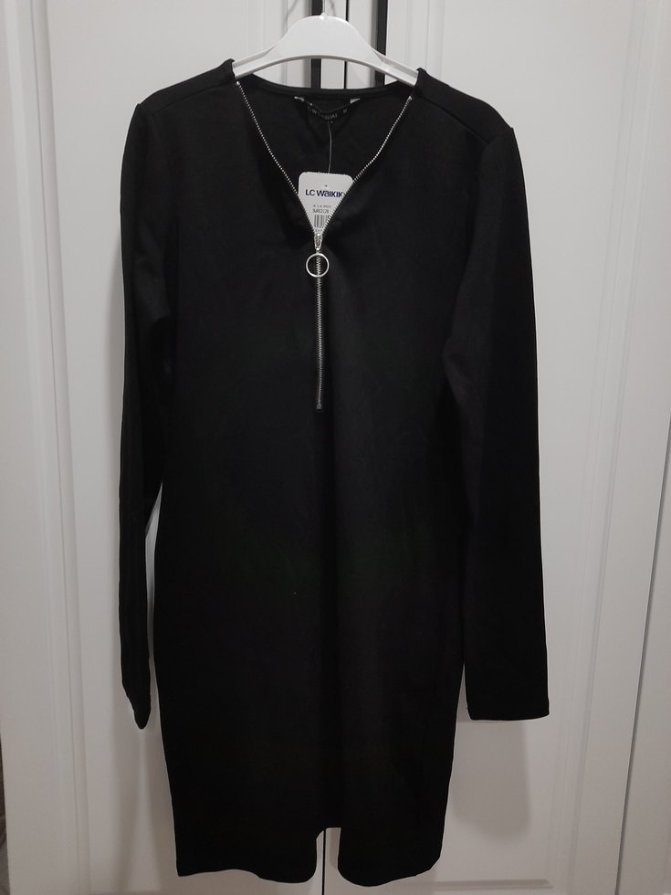Zincir detaylı, uzun kollu, bisiklet yaka, siyah fitted midi elbise. Yumuşak ve sıcak kumaştan, minimalist gotik tarzda. M beden etiketli