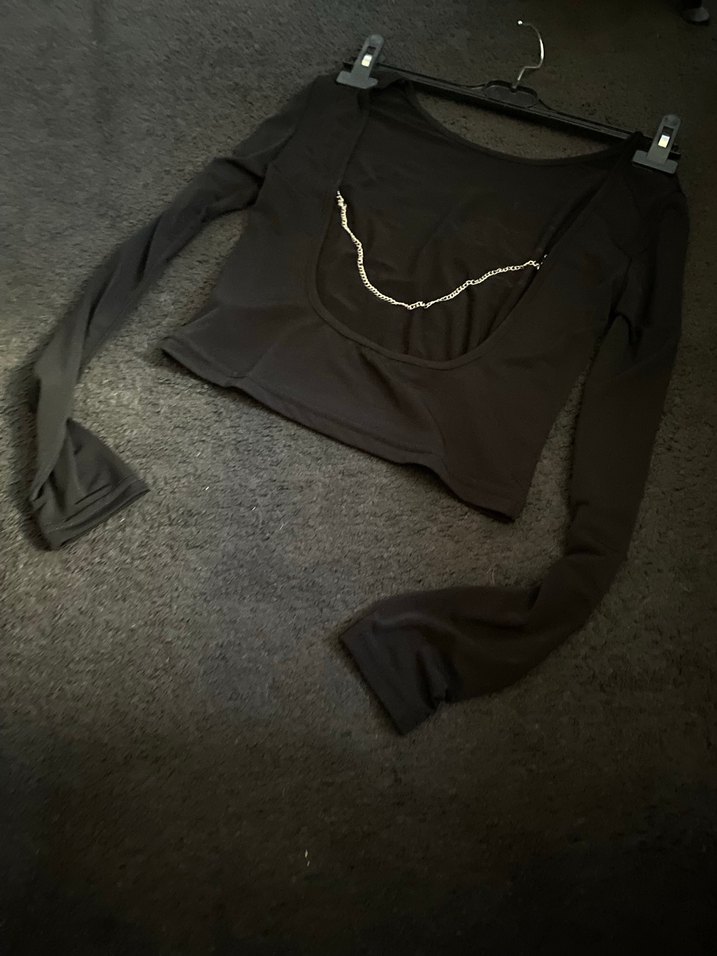 Siyah, uzun kollu, tek renk zincir detaylı, kısa boy ve tek vücut oturan goth tarzda sentetik kumaştan mini bluz. Sırt dekolteli Üncirli bady
