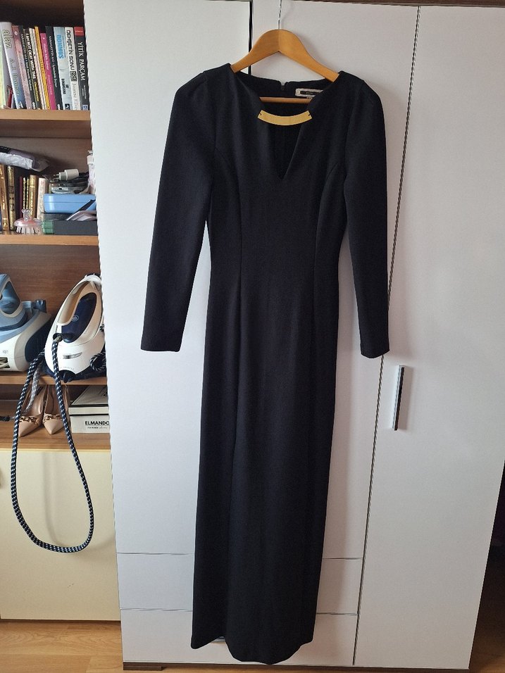V yaka ve uzun kollu, siyah, vücuda oturan uzun elbise. Yaka kısmında zincir detayı bulunur, ofis ortamına uygundur.