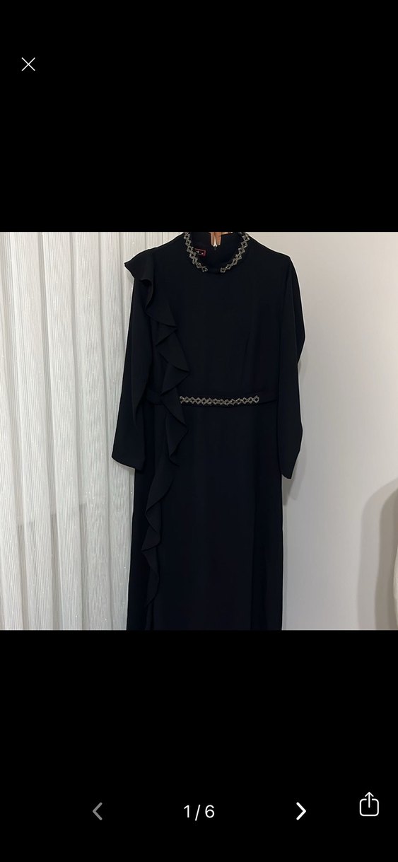 Siyah uzun kollu ve yüksek yakalı, regular fit uzun elbise. İpek dokulu kumaş, nakışlı desenler ve zincir detaylarıyla ofis için uygun, mütevazı gotik tarzı yansıtıyor.