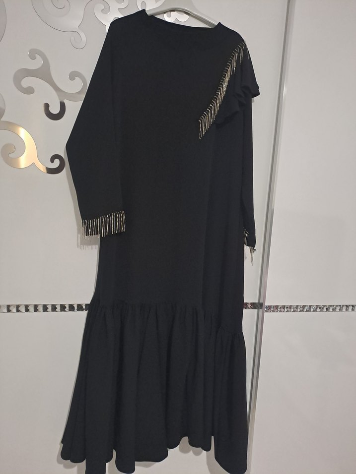 Siyah, uzun kollu ve yuvarlak yakalı, zincir detaylı ve nakışlı desenli bol kesim uzun elbise. Sentetik kumaştan, mütevazı gotik tarz için uygun.