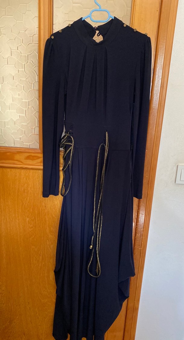 Siyah, süet kumaştan yapılmış, zincir detaylı ve halter yaka uzun, vücuda oturan elbise. Gotik tarzda, askılı kollu ve ofis kullanımı için uygun.