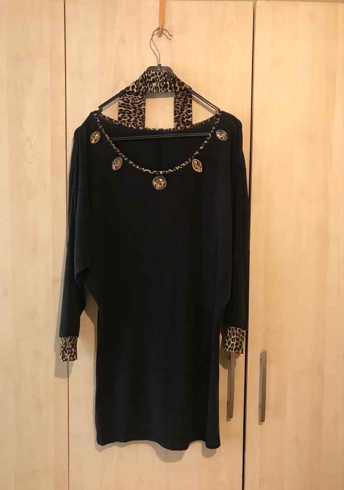 Siyah triko kumaştan, uzun kollu, yuvarlak yaka ve zincir detaylı. Manşet ve yakada leopar desenli, bol kesim uzun tunik.