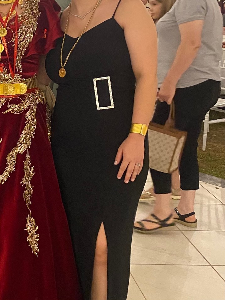 Siyah, ince askılı, V yakalı ve bu dar kesim uzun elbise, romantik akşamlar için uygundur. Yırtmaç detayı şıklık katıyor. ✨