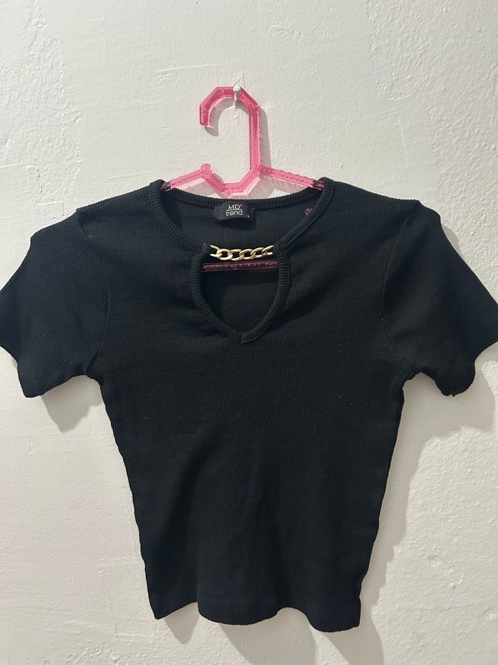 V yaka, zincir detaylı, kısa kollu, siyah, dar kesim kadın tişörtü. Kısa boylu, sentetik kumaştan, gündelik sokak stili için uygundur.
