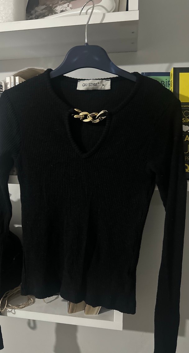 Dar kesim siyah triko kazak, uzun kollu, zincir detaylı V yaka ve hafif yılan deseni ile günlük kullanıma uygun.
