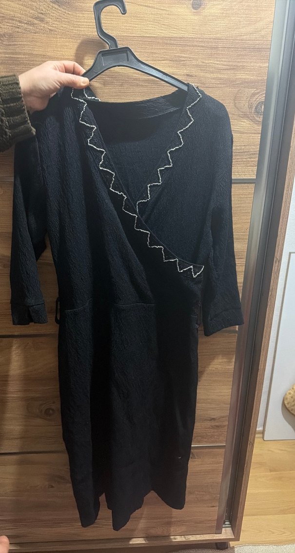 Siyah uzun elbise, V yaka zincir işlemeli detaylarla ve uzun kollu olarak rahat, bol kesim sunar, gotik tarzda.