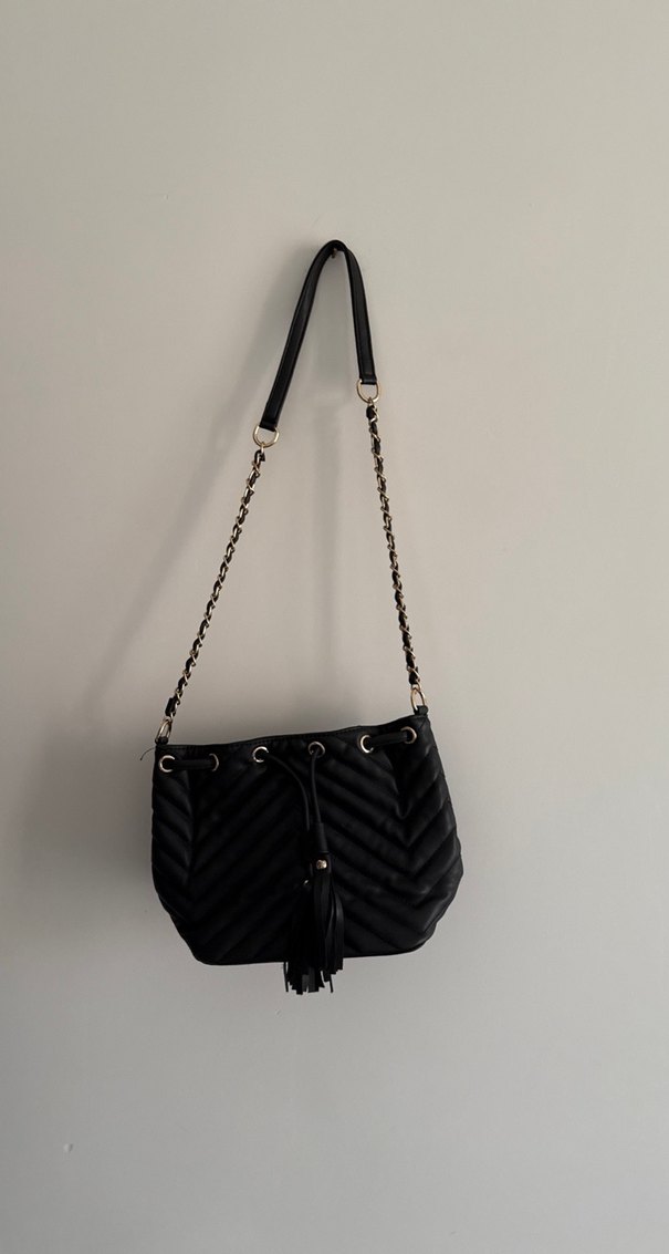 Siyah yılan baskılı deri çanta, zincir detaylı ve püsküllü. Ayarlanabilir askısı ile trend sokak stiline uygun.