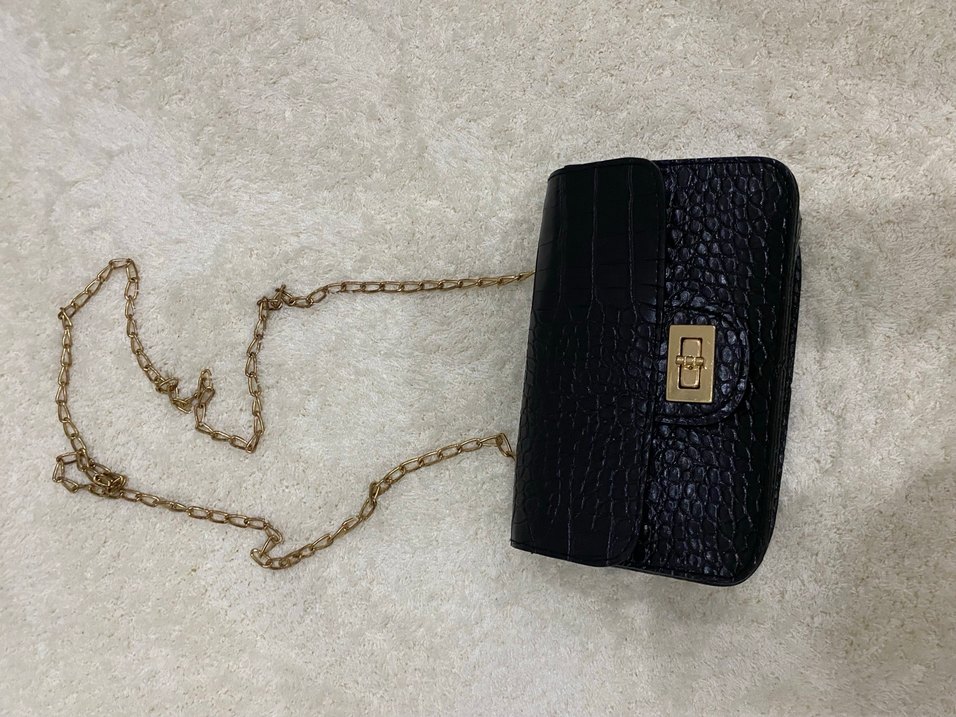 Siyah deri, yılan derisi desenli ve zincir detaylı çanta, klasik şıklığı modern tarzla buluşturuyor.