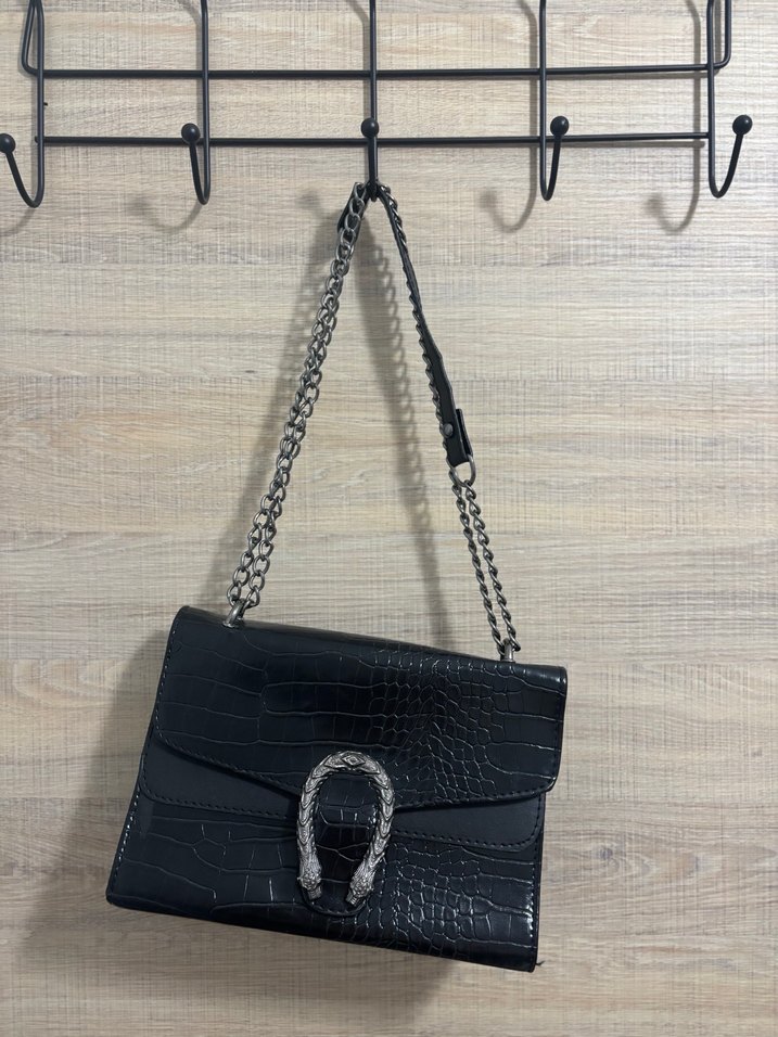 Zincir detaylı, yılan derisi desenli siyah deri çanta. Klasik zarafet ve goth stilini yansıtır, günlük kullanıma uygundur.