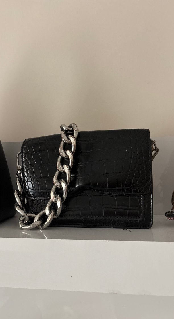 Siyah deri çanta, parlak yılan derisi deseni ve dikkat çekici zincir detayı ile trendy rahat sokak stili için uygun.