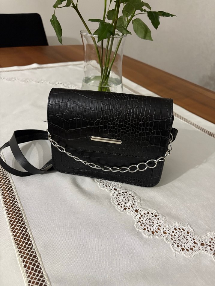 Siyah deri çanta, yılan derisi desenli ve zincir detaylıdır. Klasik zarafeti goth tarzıyla birleştirir, günlük kullanıma uygundur.