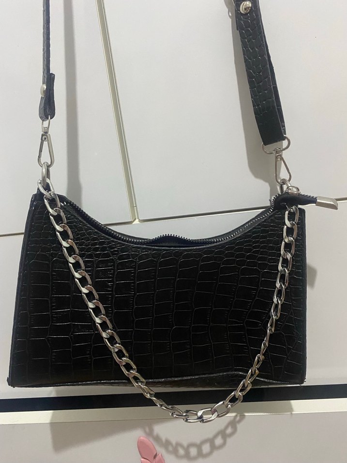 Zincir detaylı, parlak yılan derisi desenli siyah deri çanta,