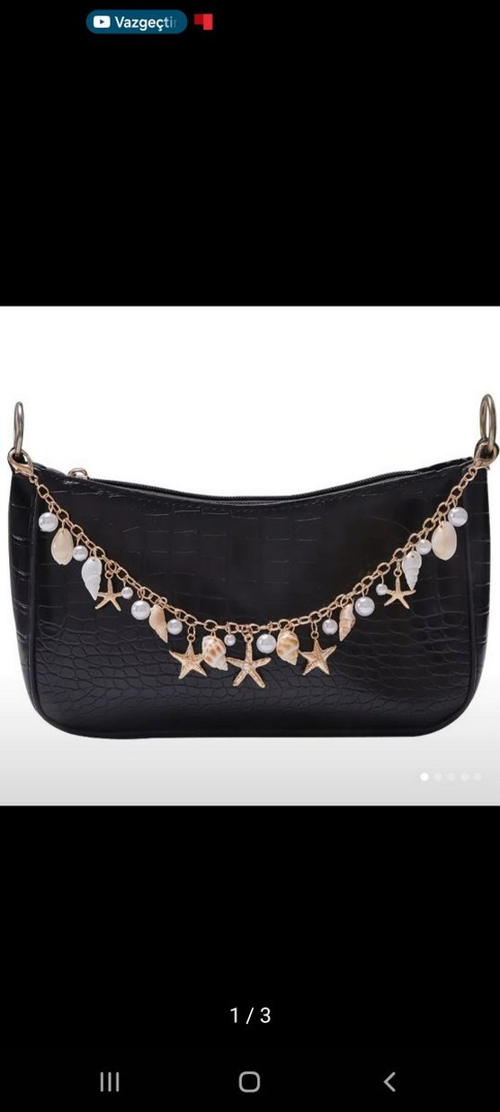 Parlak siyah yılan derisi desenli deri kadın çanta charmı. Zincir detaylı, deniz kabuğu ve denizyıldızı süslemeleri bulunur. Günlük kullanıma uygundur.