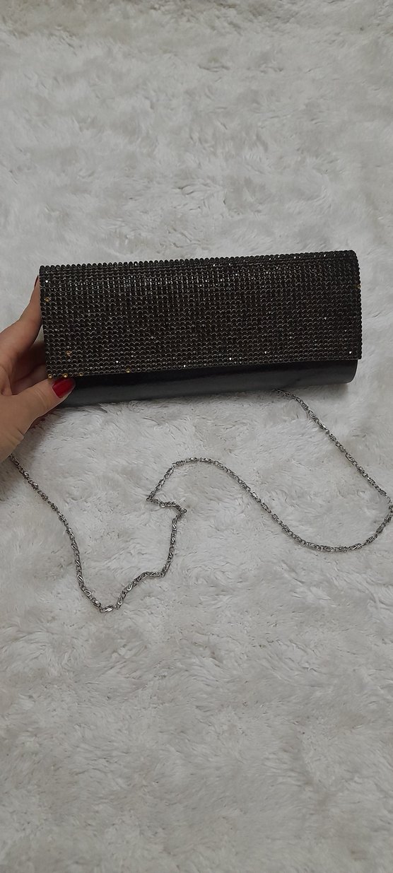 Sentetik kumaştan, zincir detaylı siyah yılan desenli abiye çanta. Parlak ve şık, gece davetleri için uygun. 1 2 taş eksiktir ama taş yapistirilabilir