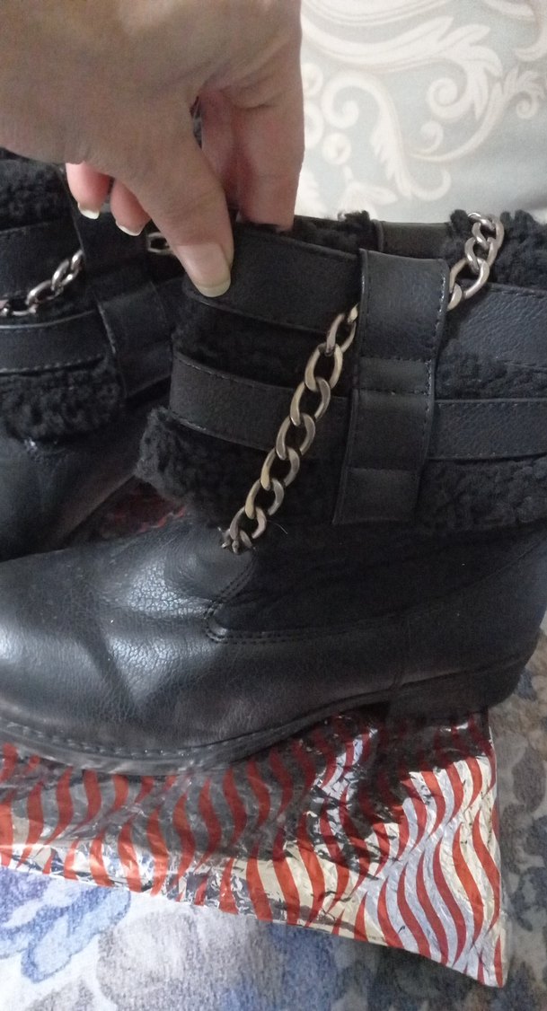 Parlak yılan desenli siyah deri botlar, zincir detaylı ve blok topukludur. Günlük kullanıma uygun grunge punk tarzını yansıtır.