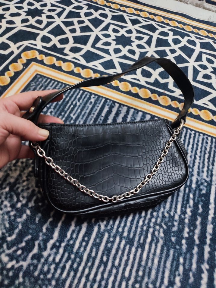 Zincir Detaylı Siyah Yılan Desenli Deri Çanta