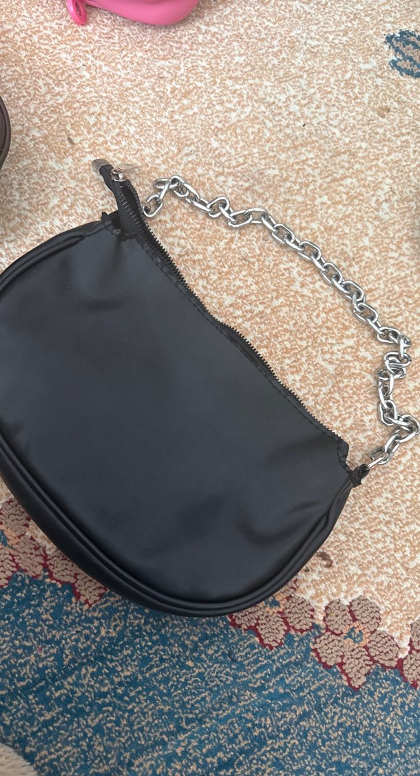 Zincir detaylı, parlak yılan desenli siyah deri çanta, trend sokak stiline uygun ve günlük kullanıma ideal.