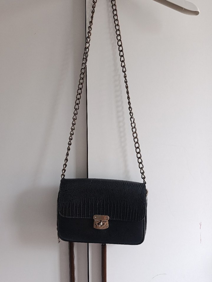 Zincir Detaylı Siyah Yılan Desenli Deri Çanta