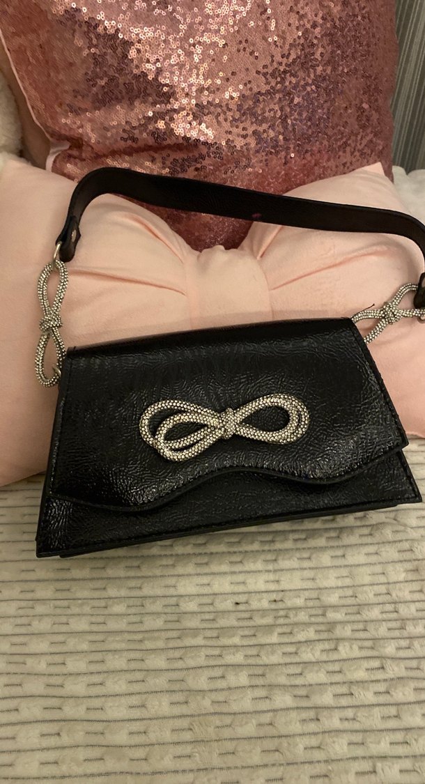 Zincir detaylı, parlak yılan desenli siyah deri çanta. Klasik ve gotik tarzda, romantik akşamlar için ideal.